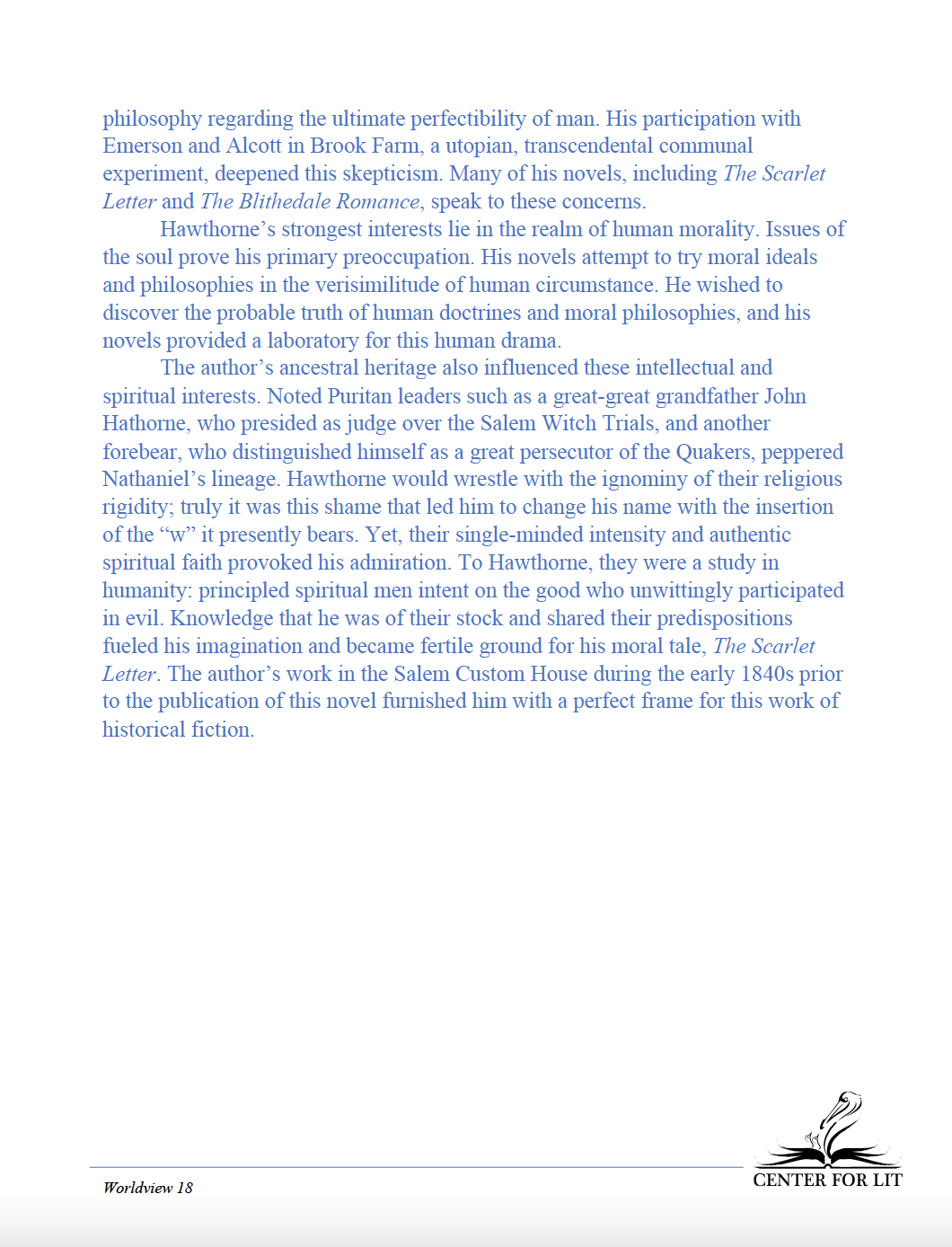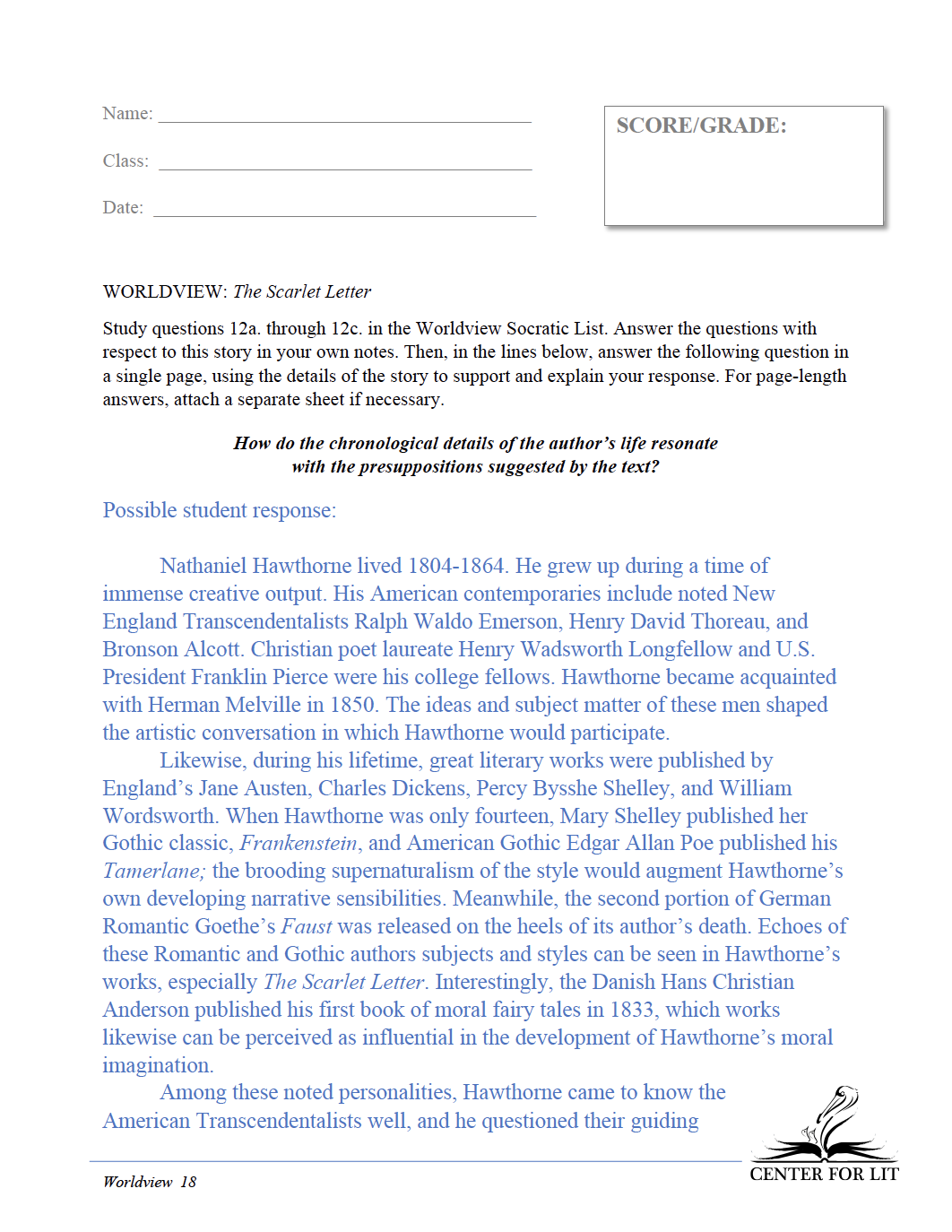 Worldview 18: The Scarlet Letter Socratic List Exercise: “How Do the Chronological Details of the Author’s Life Resonate with the Presuppositions Suggested by the Text?” Download CenterForLitAugust 7, 2019R14.12, The Scarlet Letter 0 Likes