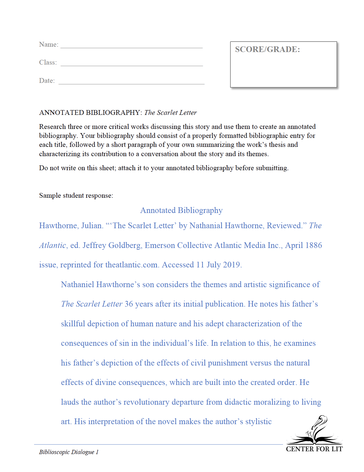 Biblioscopic Dialogue 1: The Scarlet Letter Citation Exercise: Annotated Bibliography Download CenterForLitAugust 7, 2019R17.1, The Scarlet Letter 0 Likes